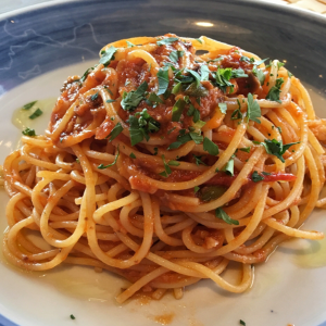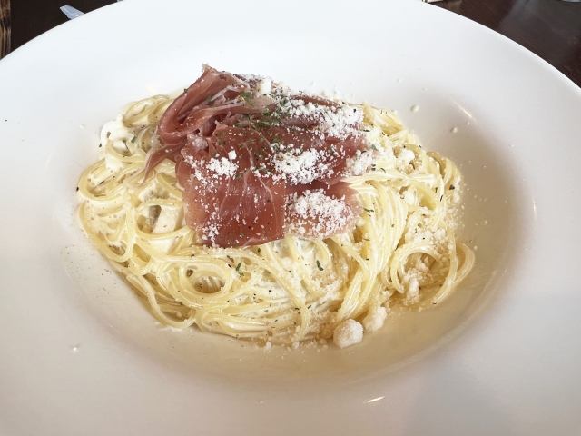 贅沢に盛り付けた生ハムの塩味が、クリーミーなソースの甘みを引き立てます。