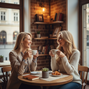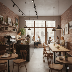 店内は木目調のやさしい雰囲気で、窓の外には緑や花が見えます。