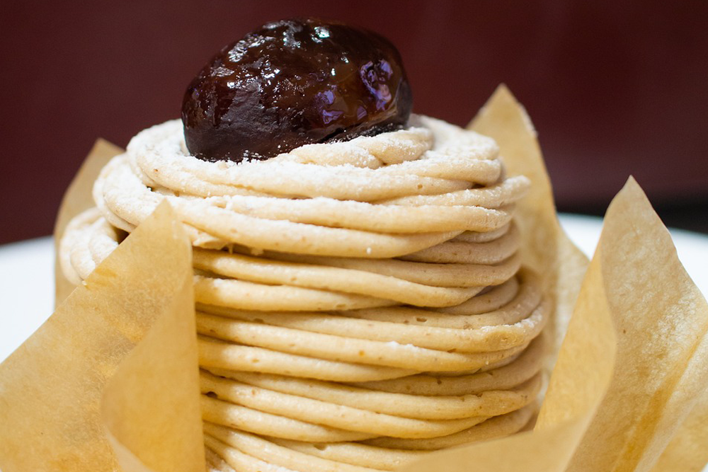 秋限定メニューでイタリア栗のモンブランが登場。イタリアは世界屈指のヨーロッパ栗名産地です。高級栗としてさまざまなお菓子に使われています。